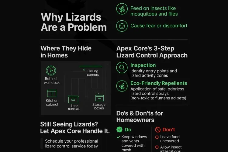 y unpleasant to see but also a sign of an underlying insect infestation, as they thrive on bugs. If you’re tired of lizards roaming your home, office, restaurant, or commercial space, Apex Core Enterprises offers specialized lizard control services across Pakistan that are safe, effective, and long-lasting.